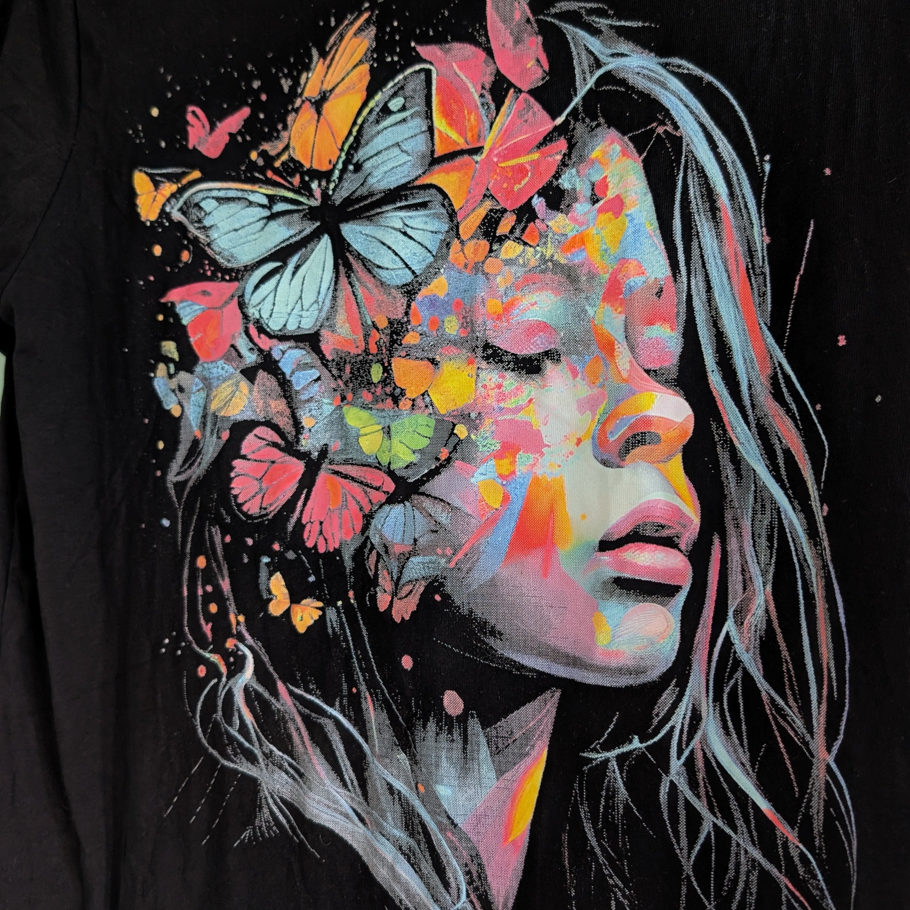 Bold, vibrant, and a little bit dreamy — this tee makes a statement without saying a word. The design features a striking portrait bursting with colour, butterflies, and pure creative energy.